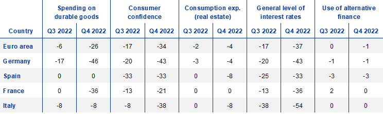 Across all four largest euro area countries, a net decrease in demand was reported. The general level of interest rates and lower consumer confidence contributed negatively towards demand in all four countries, while consumption of durables had a negative impact in Germany, France and Italy.